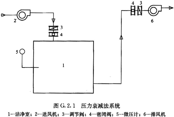 附錄G 潔凈室氣密性檢測方法 G.1 原 理 G.1.1 保持室內為正壓或負壓均能滿足檢驗要求,但條件允許時,負壓潔凈室宜用正壓檢驗,正壓潔凈室宜用負壓檢驗。 G.1.2 可按以下方法進行檢測: 1 壓力衰減法 使室內達到某一壓力(正壓或負壓),關閉加壓或抽負壓系統,觀察壓力隨時間衰減的情況,記錄下壓力衰減到起始壓力的一半時所用的時間,即為測量室內正壓或負壓的半衰期。 2 恒壓法 使室內達到某一正壓,同時向室內補氣,使室壓達到要求的穩定值而不下降時的補氣量即為漏泄量。使室內達到某一負壓,使室壓維持要求的穩定值而不下降時的抽氣量即為漏泄量。 G.2 壓力衰減法 G.2.1 測試系統如圖G.2.1所示。 G.2.2 可按以下步驟進...